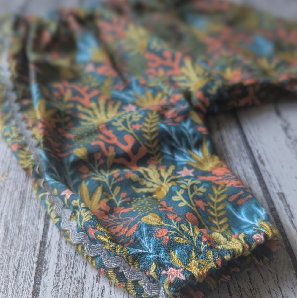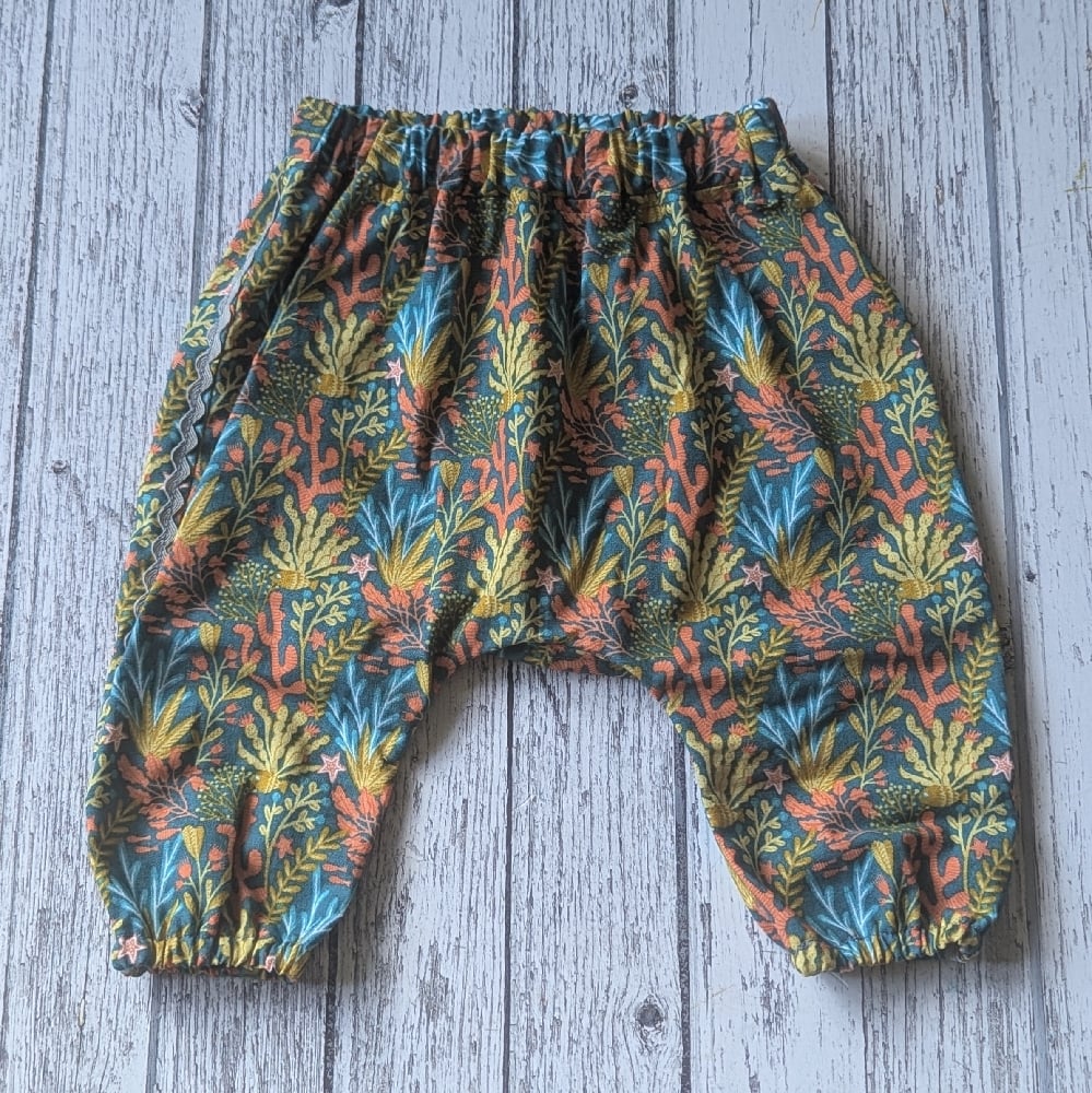Awesome little Harem trousers in an adorable Coral Reef printed cotton, hand made by myself with a blue ricrac trim down each side seam.