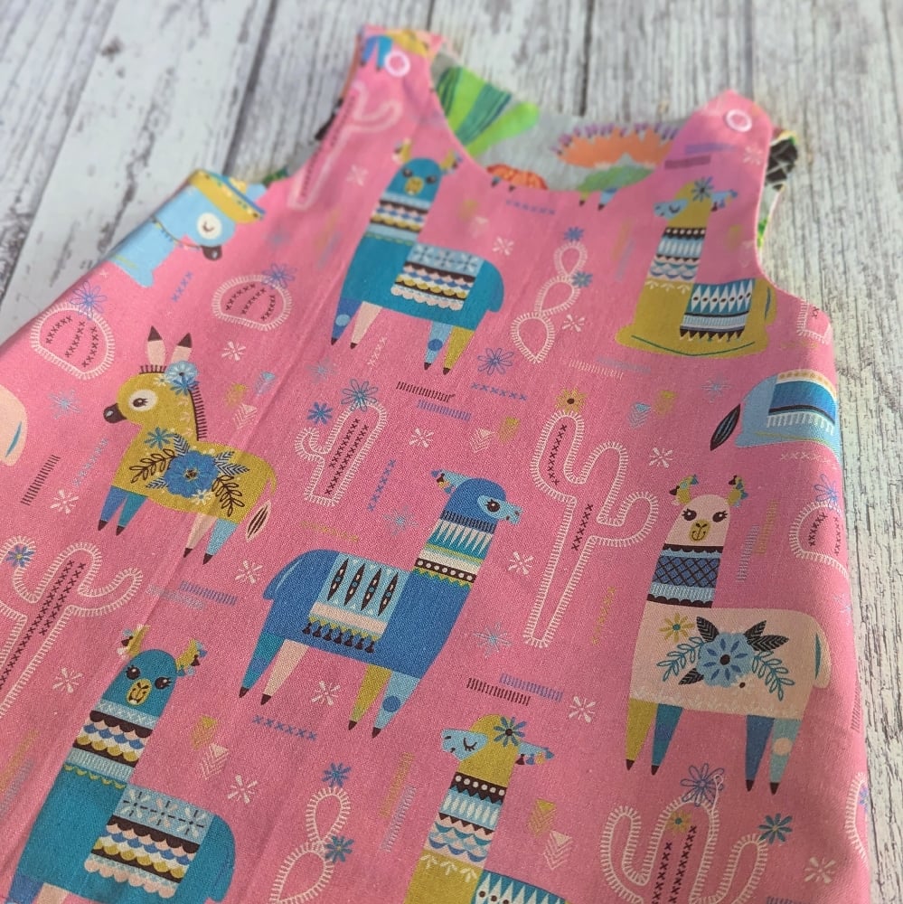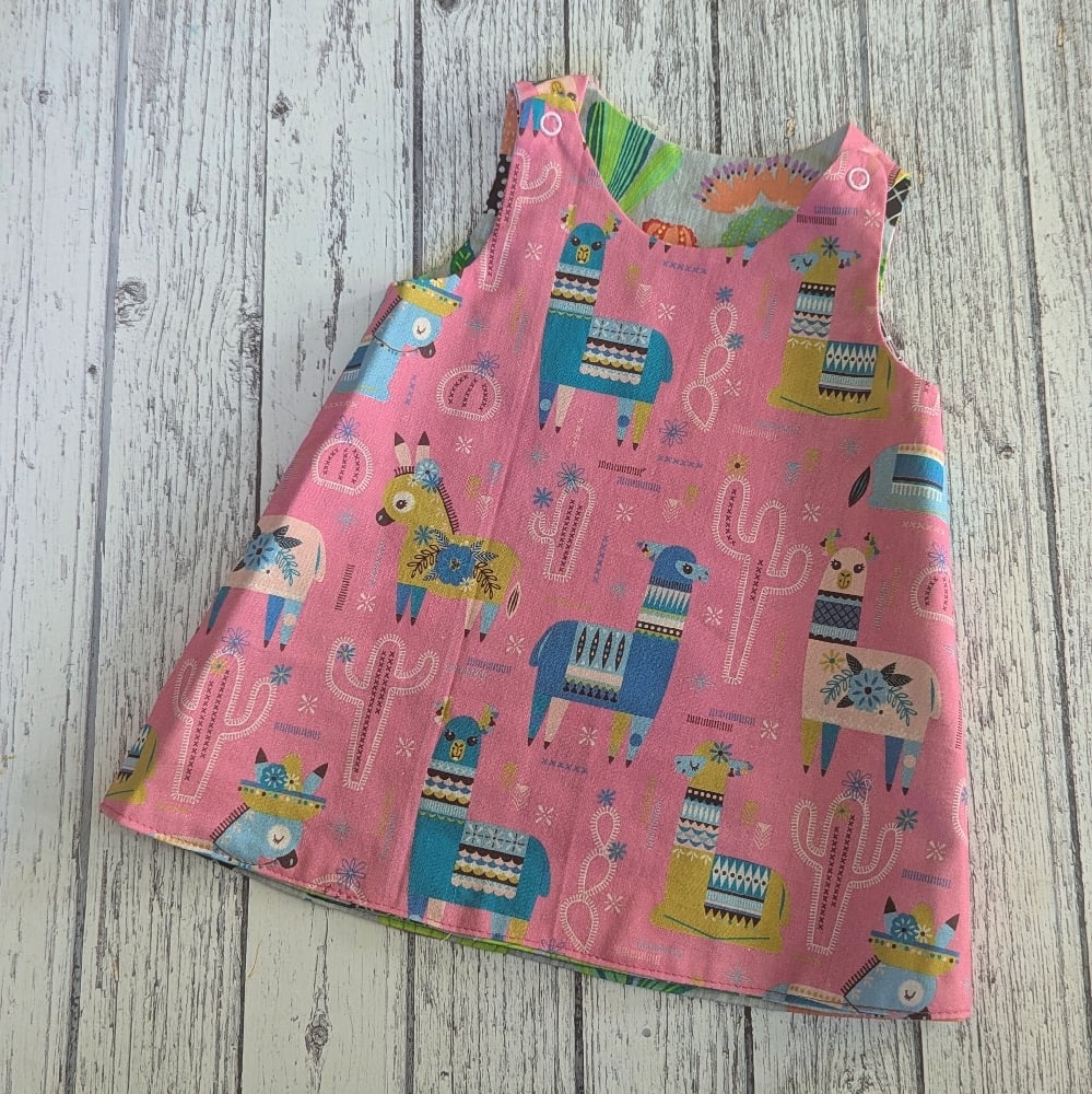 Pretty little hand made reversible dress in cactus printed and Llama printed cottons with yellow ricrac trim and press stud shoulders.