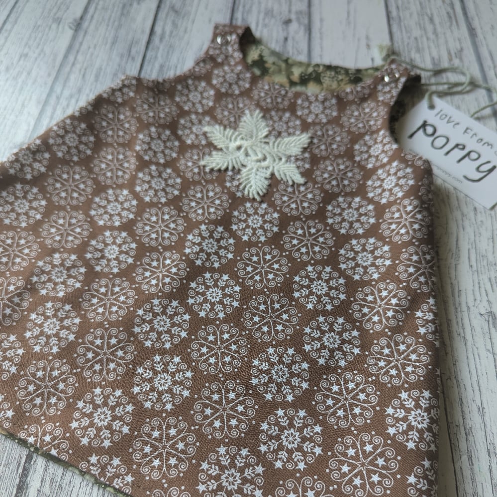 Pretty little hand made reversible dress in snowflake and floral printed cottons with ricrac and snowflake trim and press stud shoulders.